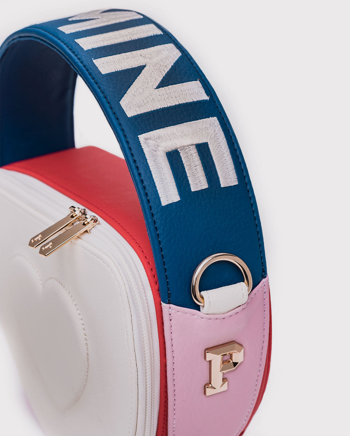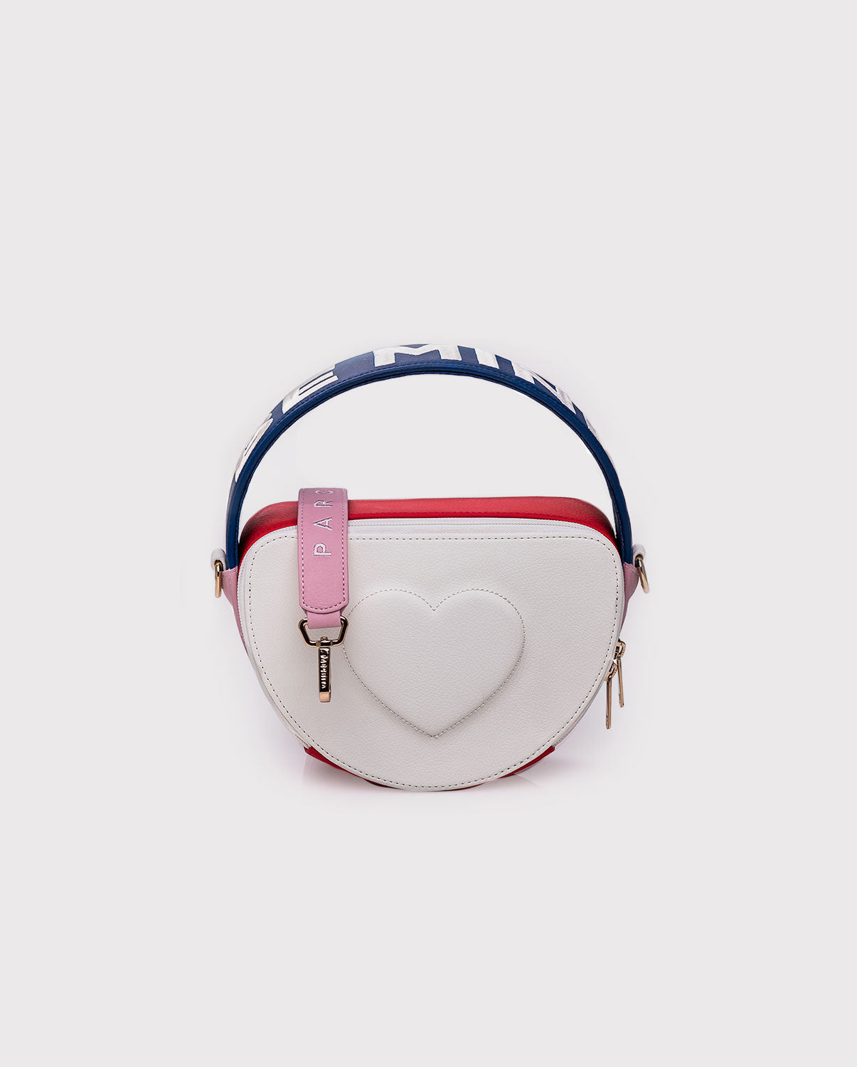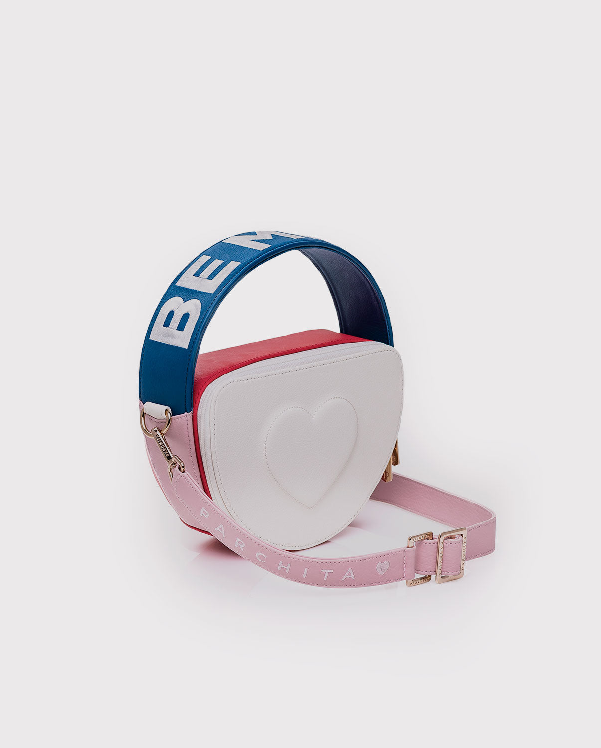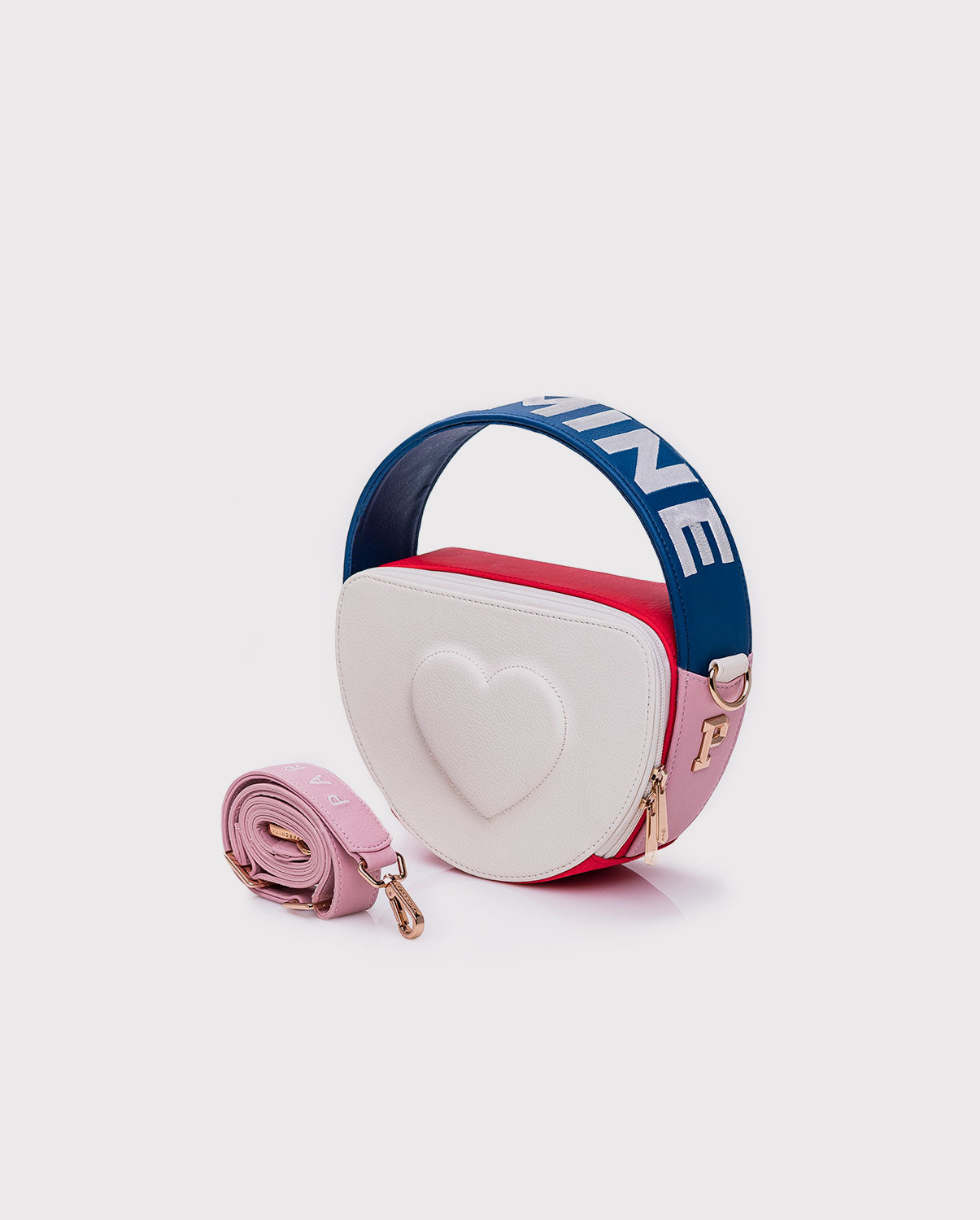 Cartera edición limitada amor y amistad. Su diseño circular estructurado en PVC, con contraste de colores colores crea una cartera dinámica y femenina. El repujado frontal en forma de corazón aporta un toque artesanal, mientras la frase “BE MINE” bordada a contraste en el asa complementa la estética romántica.